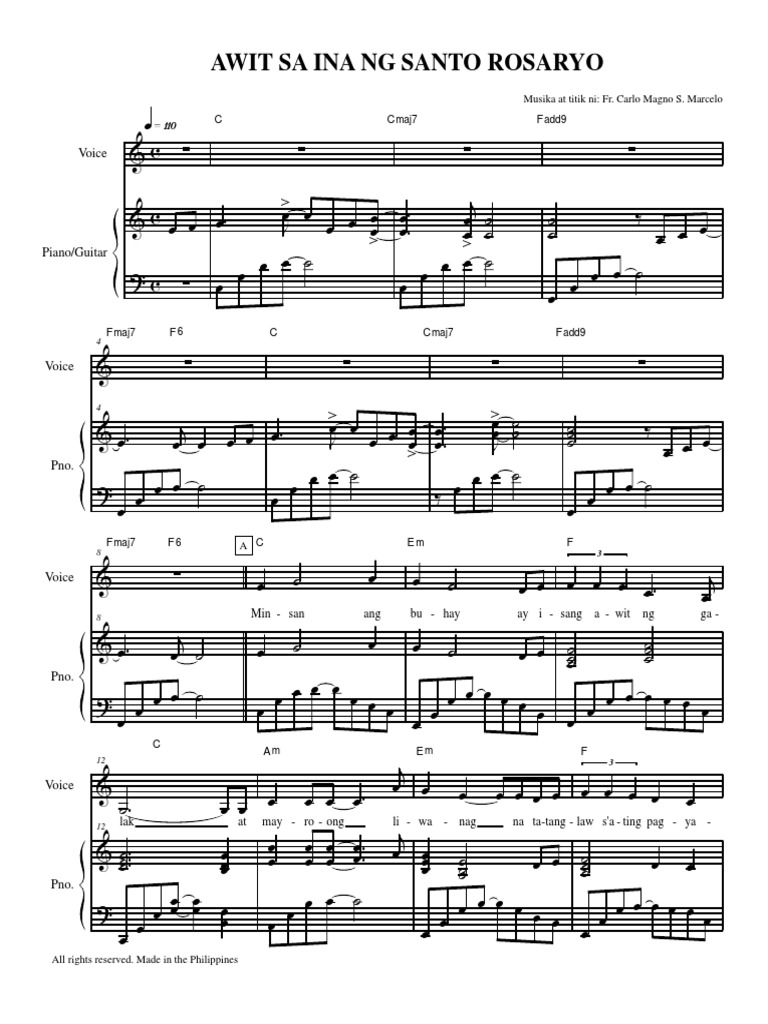 C Em F C Minsan ang buhay ay isang awit ng galak Am Em F G At mayroong liwanag na tatanglaw sa ting pagyapak. Awit Sa Ina Ng Santo Rosaryo has a BPMtempo of 95 is in the key D Major and has a duration of 0352. Download and print in PDF or MIDI free sheet music for Awit Sa Ina Ng Santo Rosaryo by Fr.