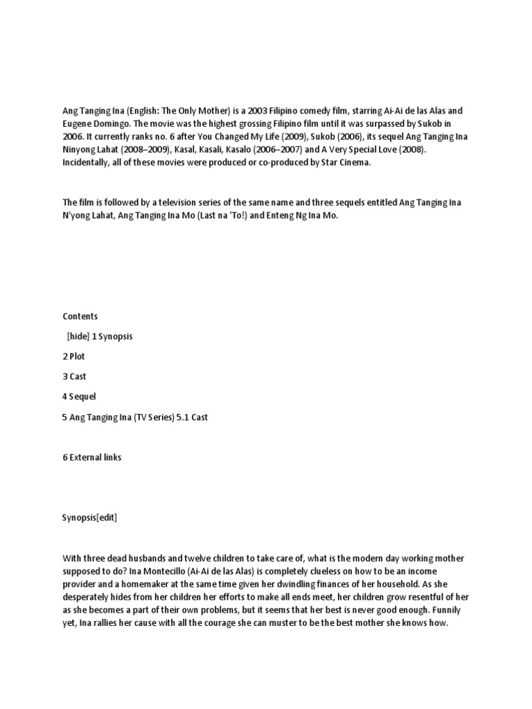 Ang tanging ina buod ng pelikula. 11 -15 Panuto. Ang Tanging Ina Nyong Lahat lit. The story evolves around the ups and downs of being a single mother Ina Ai-Ai delas Alas the main protagonist.