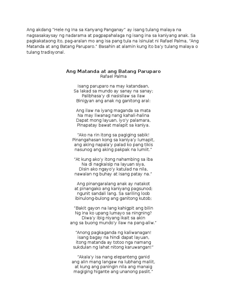 Ang ina o nanay ang persona sa Hele ng ina sa kanyang panganay na kung saan ay siya ang tinutukoy na ina ng bata. Save Save Hele Ng Ina Sa Kanyang Panganay For Later. Mababatid sa tulang ito ang magkakaibang damdami ng isang ina kasabay ng walang kapantay niyang kaligayahan sa pagsilang ng kaniyang unang anak.