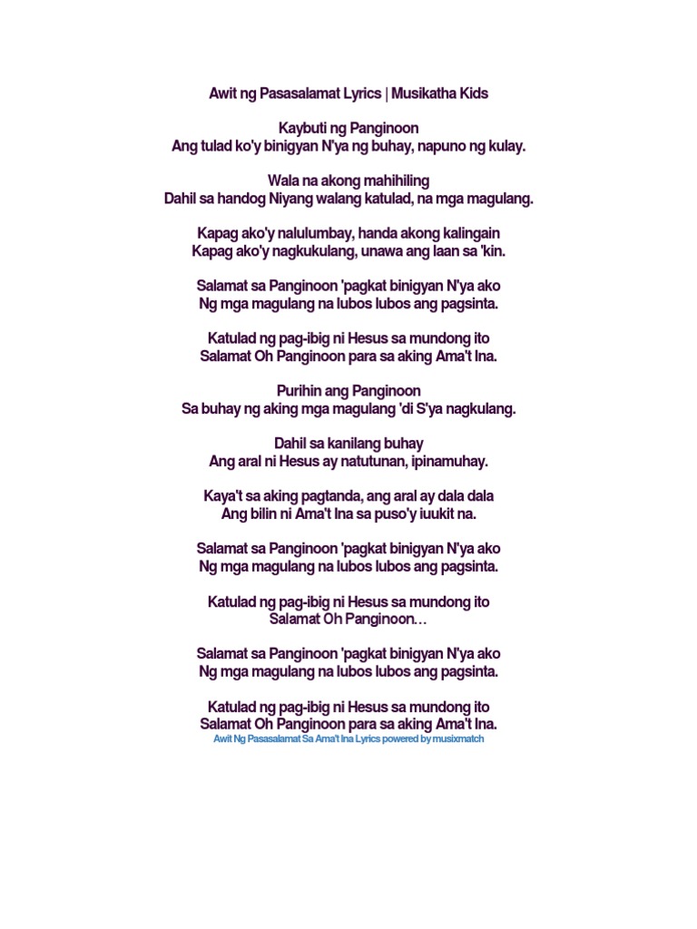 Di pa raw marunong mag isa dahil bata pa nga. Salamat sa Panginoon pagkat binigyan Nya ako Ng. Listen to Awit Ng Pasasalamat Sa Amat Ina MP3 Song by Musikatha Kids from the Tagalog movie Ang Kwento Ng Aklat Ni Lolo free online on Gaana.