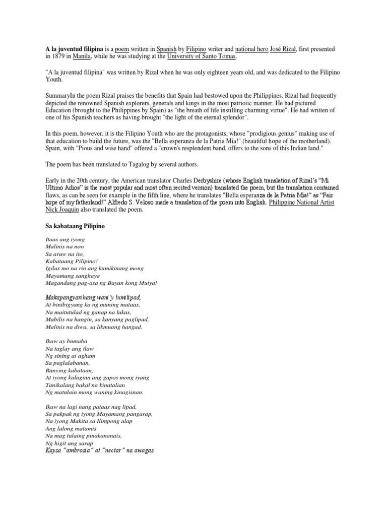 Record the pronunciation of this word in your own voice and play it to listen to how you have pronounced it. Rizal wrote this literary poem when he was still studying at the University of Sto. A LA JUVENTUD FILIPINA To the Filipino Youth.