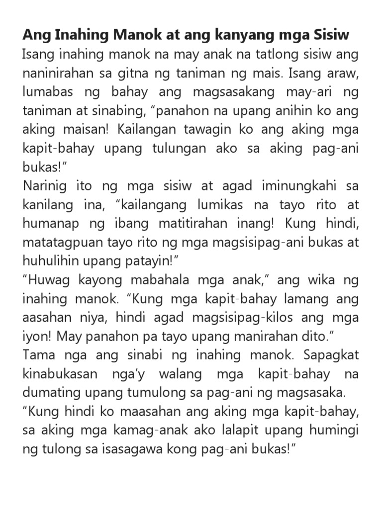 Ilang araw lang ay sumibol na ang mga binhi. Noong unang panahon sa isang bukid doon nakatira ang isang inahing manok kasama ang apat niyang sisiw. Ang Inahing Manok at ang Kanyang Mga Sisiw Isang inahing manok na may anak na tatlong sisiw ang naninirahan sa gitna ng taniman ng mais.