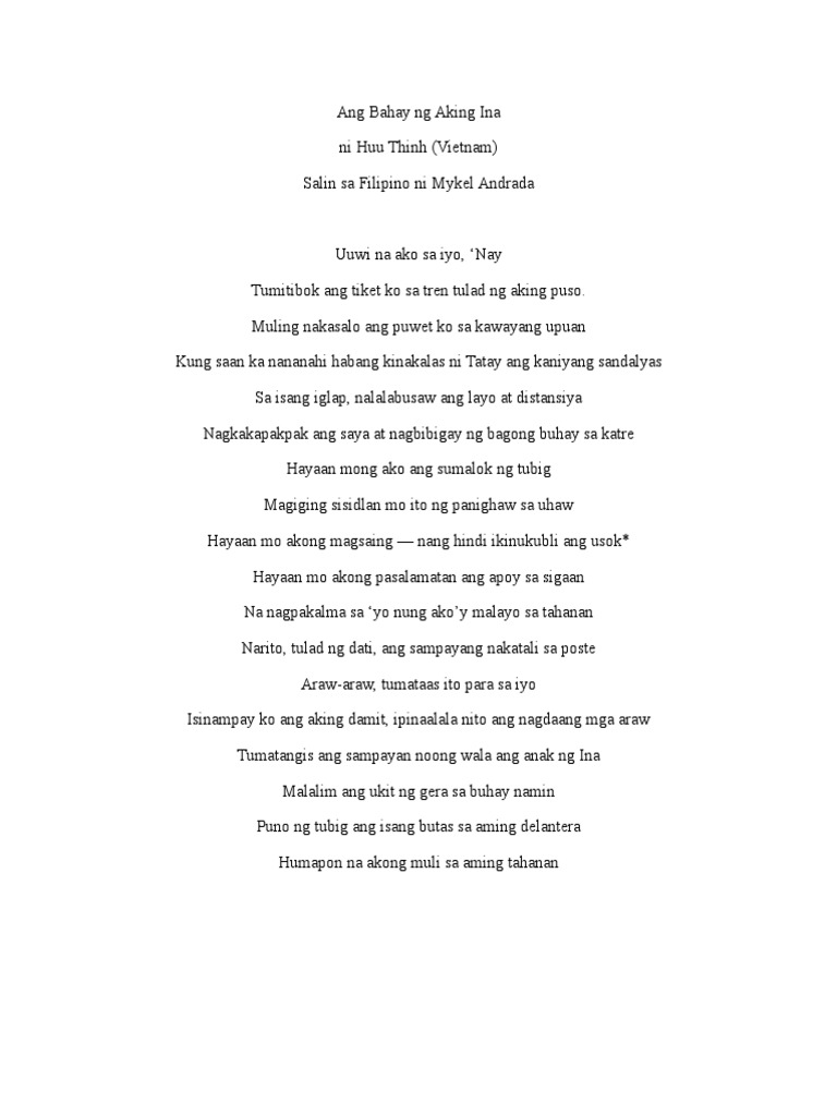 Bisa Sa Damdamin Aking nabatid ang pasakit ng aking Ina ganun din ang ibang Ina o Nanay sa buong mundo. ANG BAHAY NG AKING INA TULA NI HUU THINH VIETNAM SALIN SA FILIPINO NI. Sumasayaw ang mga dahon sa pag-ihip ng hangin.